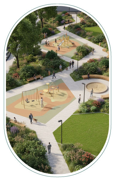 Desenvolvemos soluções que integram natureza e cidade como telhados vegetados, reflorestamento, áreas permeáveis, arborização, paisagismo e EVUs.